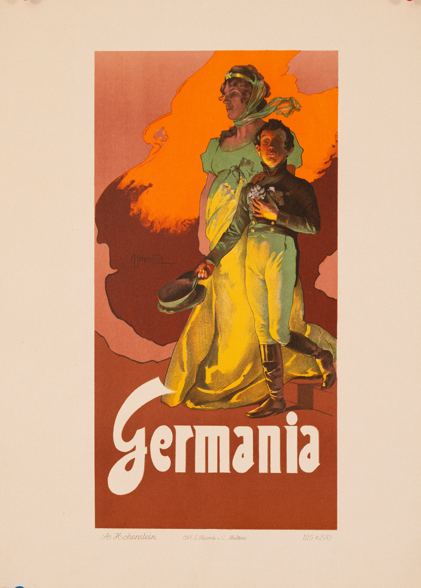 Lithographic plate reproducing the poster design Germania by Adolfo Hohenstein, issued as part of the well-known Ricordi Portfolio. This series presented a selection of important poster designs printed by the Ricordi publishing house during the height of the Italian poster movement between the late nineteenth and early twentieth centuries. The portfolio gathered together small-format reproductions of these works and was distributed internationally in the early twentieth century.