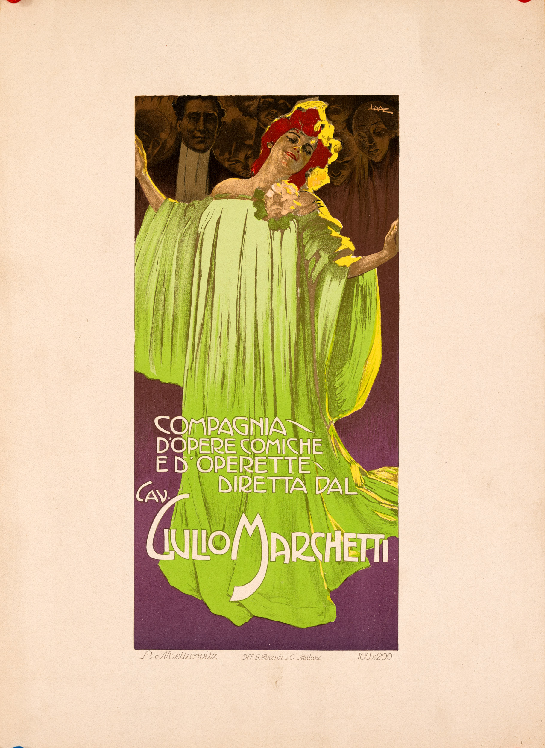 Casa Ricordi of Milan, originally a music publisher closely associated with the Italian opera world, developed a major lithographic printing workshop in the late nineteenth century. Through its printing department the firm produced posters for music, theatre, and commercial clients and became a central force in the development of the Italian poster. The artists working with Ricordi helped define the Italian version of Art Nouveau, often referred to as Stile Liberty.
