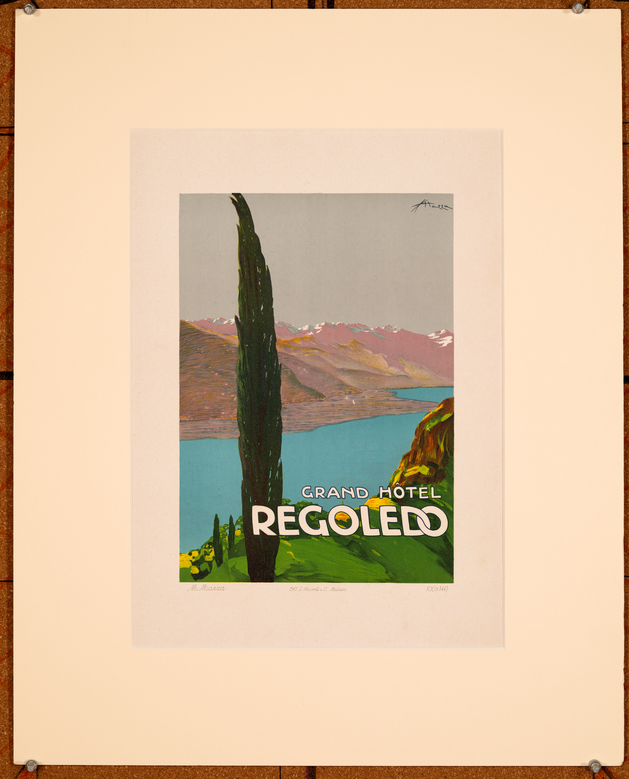 Lithographic plate reproducing the poster design Grand Hotel Regoledo by Aldo Mazza issued as part of the well-known Ricordi Portfolio. This series presented a selection of important poster designs printed by the Ricordi publishing house during the height of the Italian poster movement between the late nineteenth and early twentieth centuries. The portfolio gathered together small-format reproductions of these works and was distributed internationally in the early twentieth century.