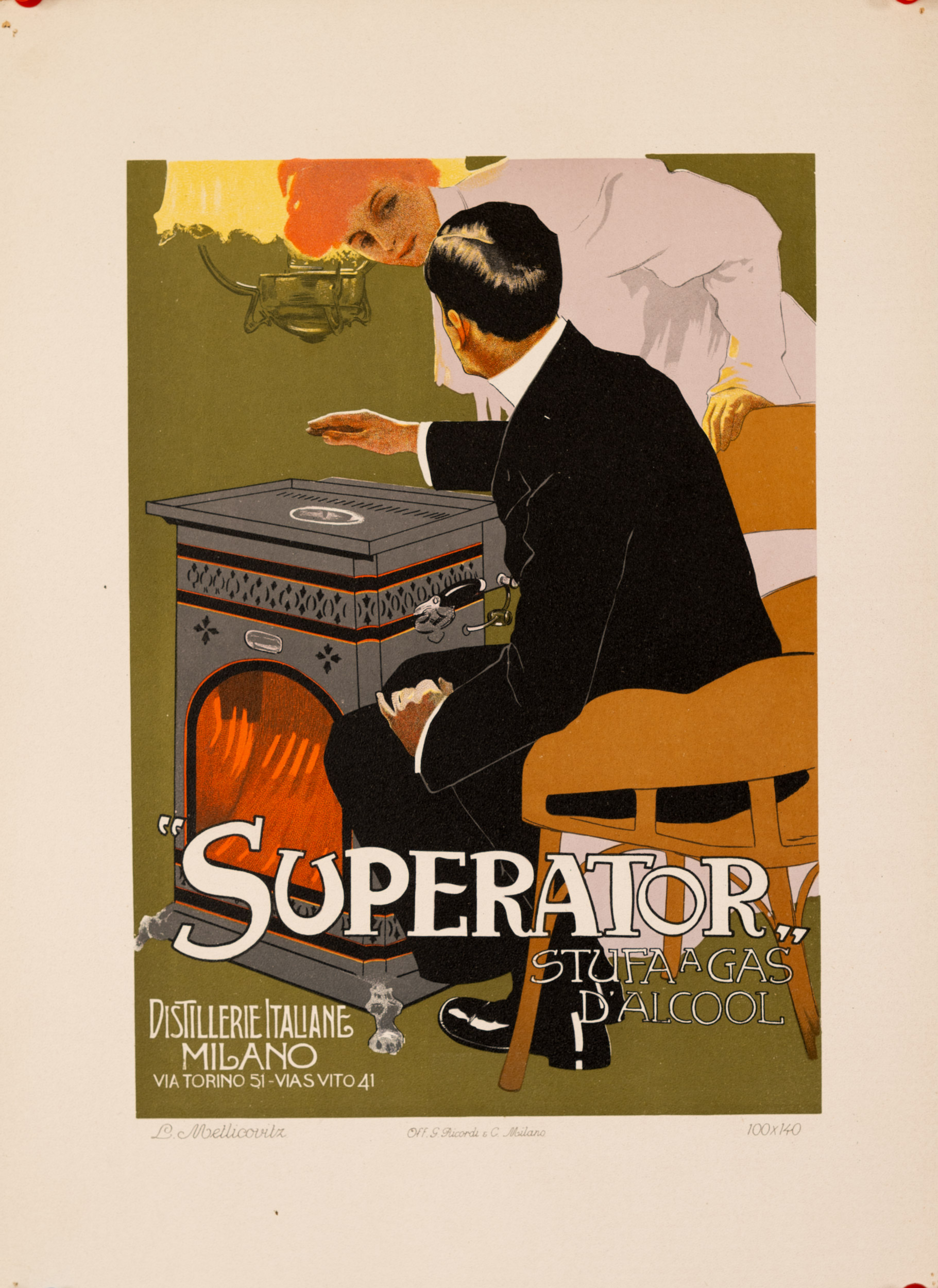 Lithographic plate reproducing the poster design Superator by Leopoldo Metlicovitz, issued as part of the well-known Ricordi Portfolio. This series presented a selection of important poster designs printed by the Ricordi publishing house during the height of the Italian poster movement between the late nineteenth and early twentieth centuries. The portfolio gathered together small-format reproductions of these works and was distributed internationally in the early twentieth century.